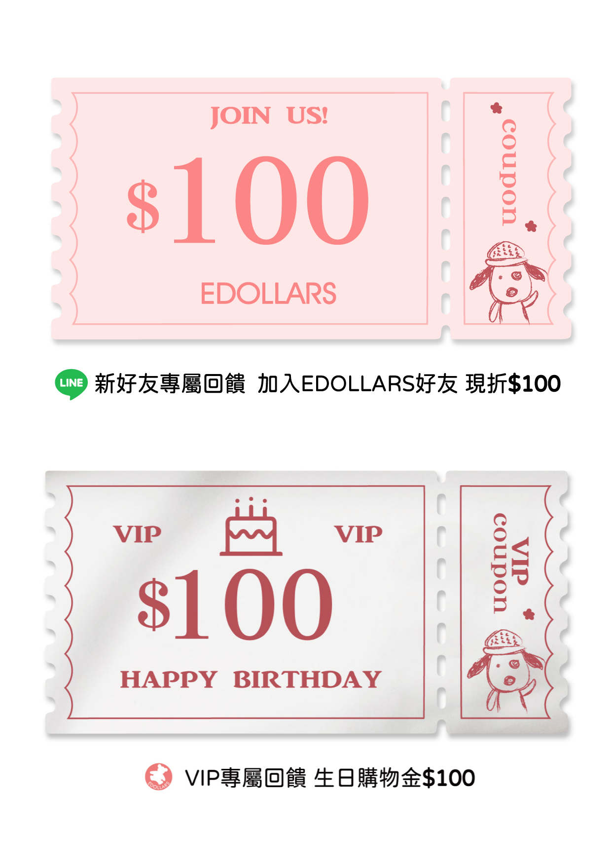 【VIP專屬回饋】 :成為EDOLLARS VIP會員每年可享有NT$100生日購物金。(生日當天發放唷!)